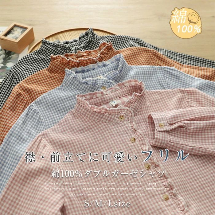ガーゼシャツ フリル シャツ ブラウス チェック柄 綿100% レデ