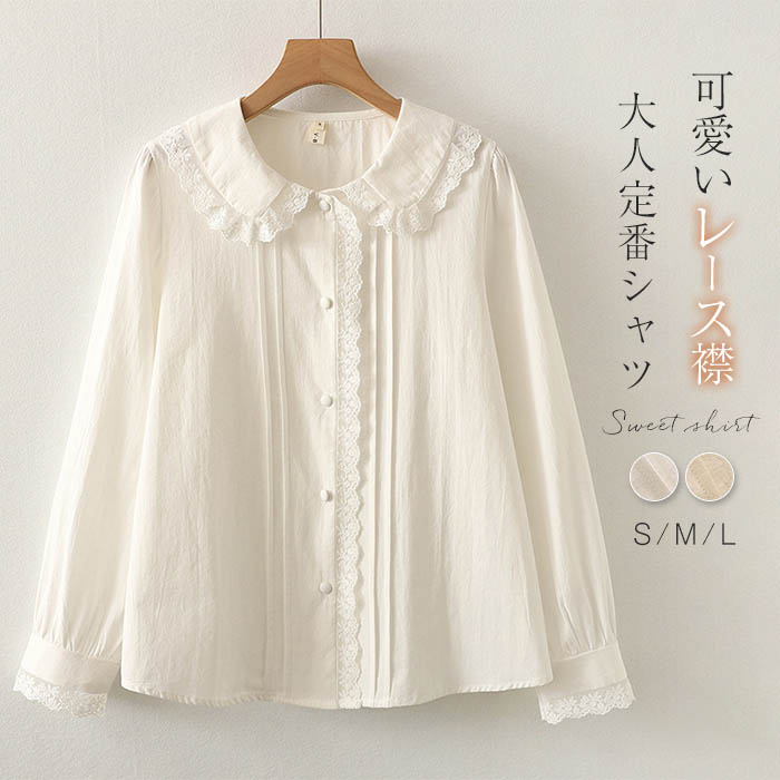 レース襟 シャツ レディース 長袖シャツ 綿 柔らかい シャツブラウス トップス 丸襟 レース 春 秋 冬 シンプル 大人 おしゃれ ファッション 体型カバー 大人可愛い ピンタック 森ガール
