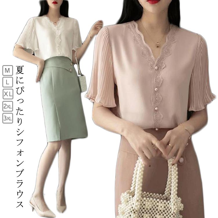 ブラウス シフォンブラウス 半袖 レディース フレア 甘いブラウス シャツブラウス 可愛い トップス 前開き Vネック レース 大きいサイズ 大人 かわいい フェミニン オフィス カジュアル 通 上品
