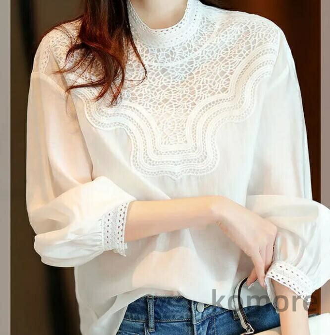 シャツ ブラウス レース 胸元レース 刺 レディース トップス スタンドアウェーカラー ロングシャツ チュニック風 ボリューム
