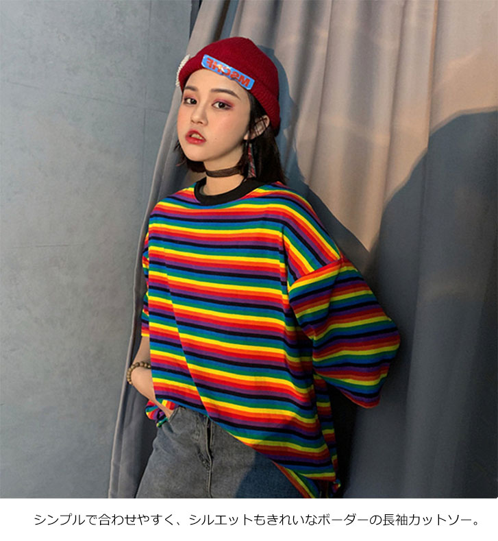 レインボー ボーダー Tシャツ ロング ゆるTシャツ トップス カラフル レディース カラフルボーダー ラウンドネック ゆったり AA カジュアル