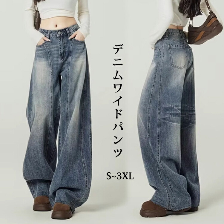 韓国 ストレート ワイドパンツ ユーズド風 レディース 体型カバー ロングパンツ 春秋 おしゃれ ゆったり ワイド パンツ デニム