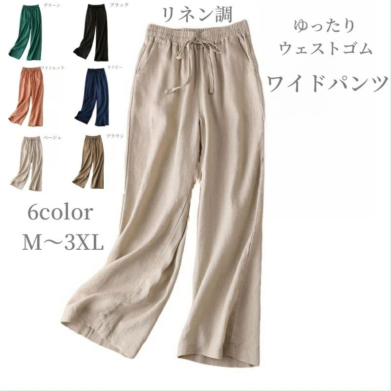 ワイドパンツ レディース きれいめ 春 夏 大きいサイズ ウエストゴム パンツ イージーパンツ 涼しい 綿麻 リネン ボトムス コットン リラックス シンプル ゆったり 体型カ ルーズ