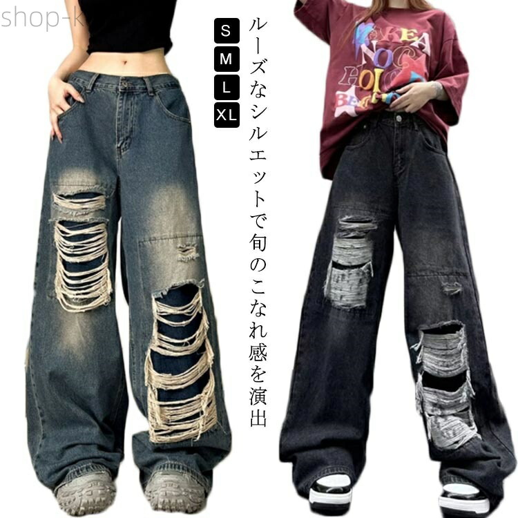 春秋 デニム パンツ 韓国 レディース ワイドパンツ ワイド ゆったり ロングパンツ おしゃれ ユーズド風 ストレート