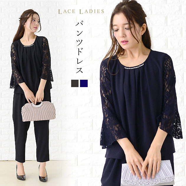 パーティードレス パンツドレス セットアップ 結婚式 二次会 披露宴 お呼ばれ 食事 大人 フォーマル 上品 20代 30代 40代 レディース 春 夏 秋 冬 7分袖 黒色 ブラック 紺 花柄レース