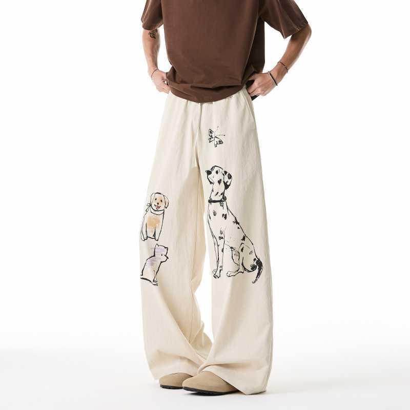 カジュアルパンツ メンズ ストレッチ 落書き風 子犬 プリント アメカジ ゆったり ワイド ストレート ロング丈 ポリエステル スポーツ 着回し 夏 大きいサイズ ルームウェア