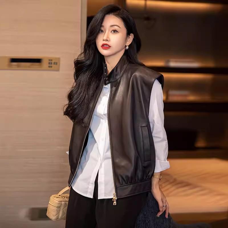 ノースリーブ ベスト レディース 秋 レトロ ゆったり 立襟 革 シープスキン アウター 素材 柔らかい タッチ カジュアル レイヤード 通勤用 普段使い スタイル