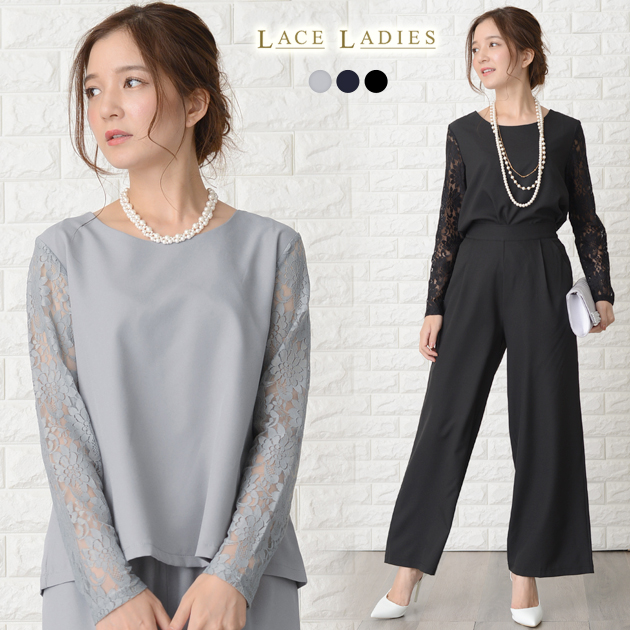 花柄レース袖 パンツドレス セットアップ パーティドレス 結婚式 披露宴 二次会 女子会 謝恩会 発表会 演奏会 お呼ばれ 長袖 袖あり 袖付き ブラック ネイビー ロング丈 大きいサイズ パ グレー