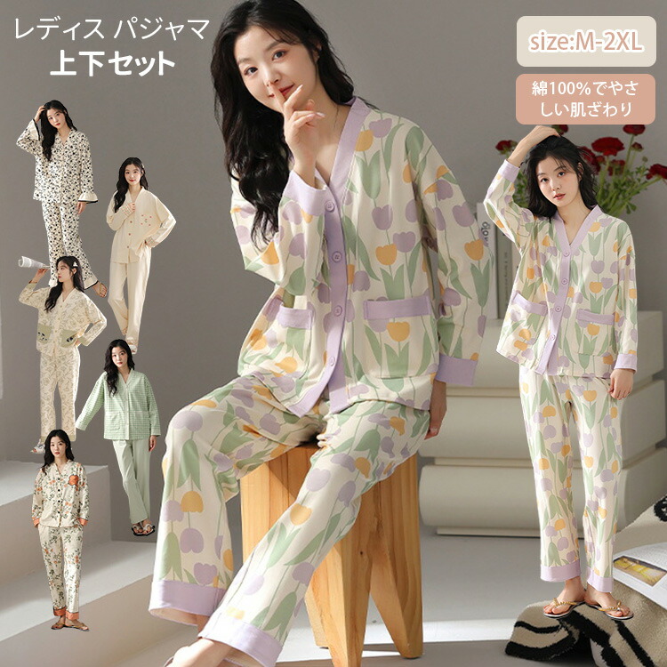 全5色 全4サイズ パジャマ 綿100% 上下セット レディース ルームウェア ナイトウェア 寝巻き トップス ボトムス 長袖 春秋用 秋冬用 春夏 カジュアル ゆったり 大きいサイズ あったか 花柄