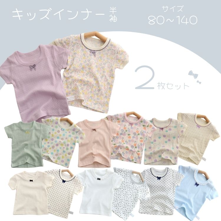 2枚セット 子ども 半袖 肌着 かわいい 絵柄 リボン 花 ねこ 水玉 フリル ガーリー トップス 綿100 女の子 キッズインナー ピンク ホワイト パープル ブルー 保育園 80 90 幼稚園