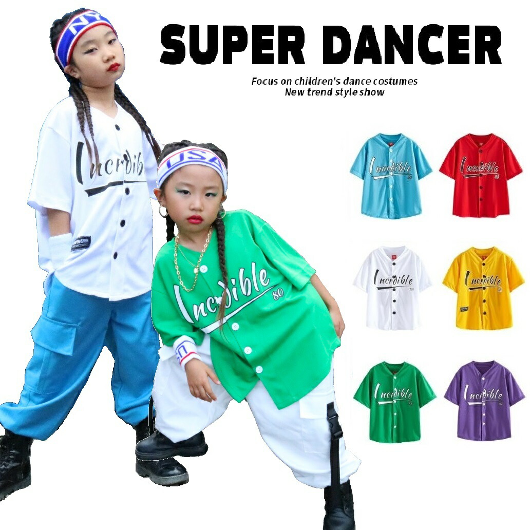 ベースボールシャツ ダンス衣装 キッズ ヒップホップ キッズダンス衣装 派手トップス シャツ 男の子 ガールズ 韓国 K-POP 赤 水色 紫 白 緑 青 黄色