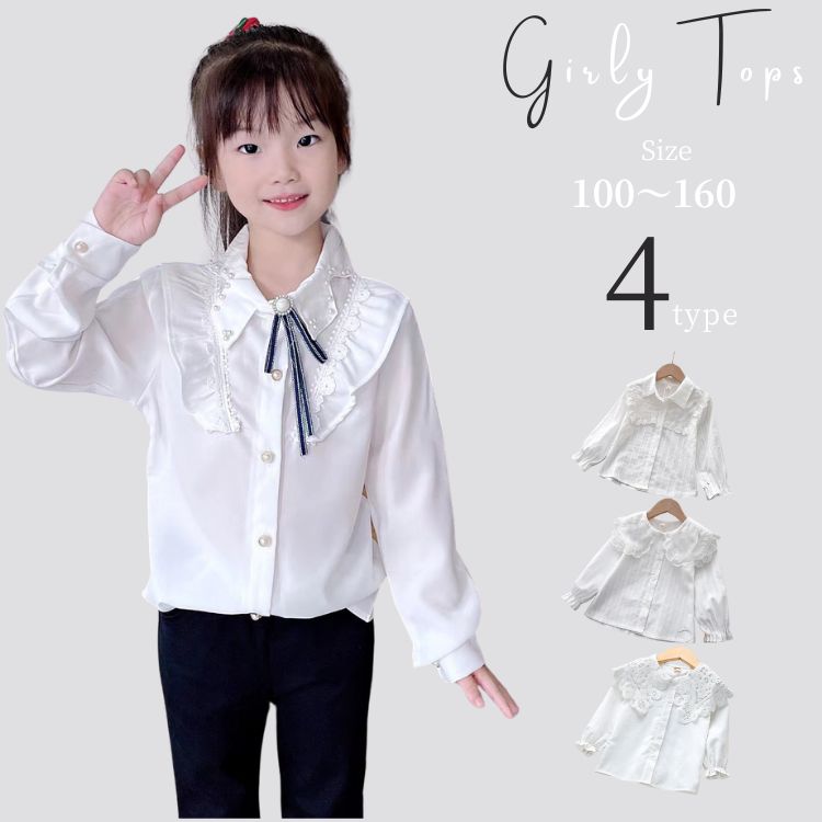 4タイプ ガーリー キッズ シャツ フリル レース 子供 トップス 長袖 女の子 ビッグカラー キッズブラウス パール リボン 花 丸襟 フリルトリム 入学式 幼稚園 ホワイト かわいい お揃 学生