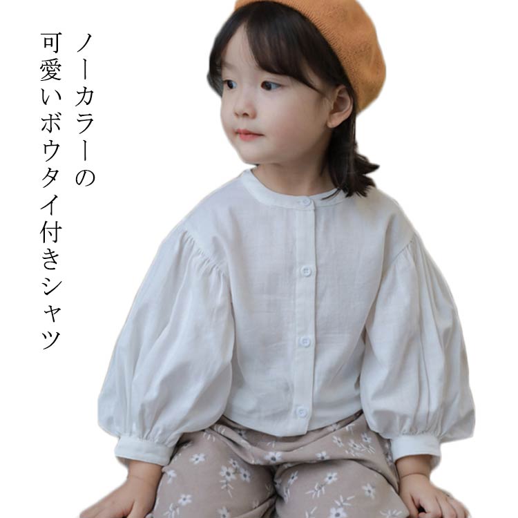 前開き シャツ 子供 長袖 カットソー キッズ 女の子 ジュニア ブラウス 子供服 ボリューム袖 バルーン袖 フロントボタン 春秋 トップス ノーカラー こども 子 長そで