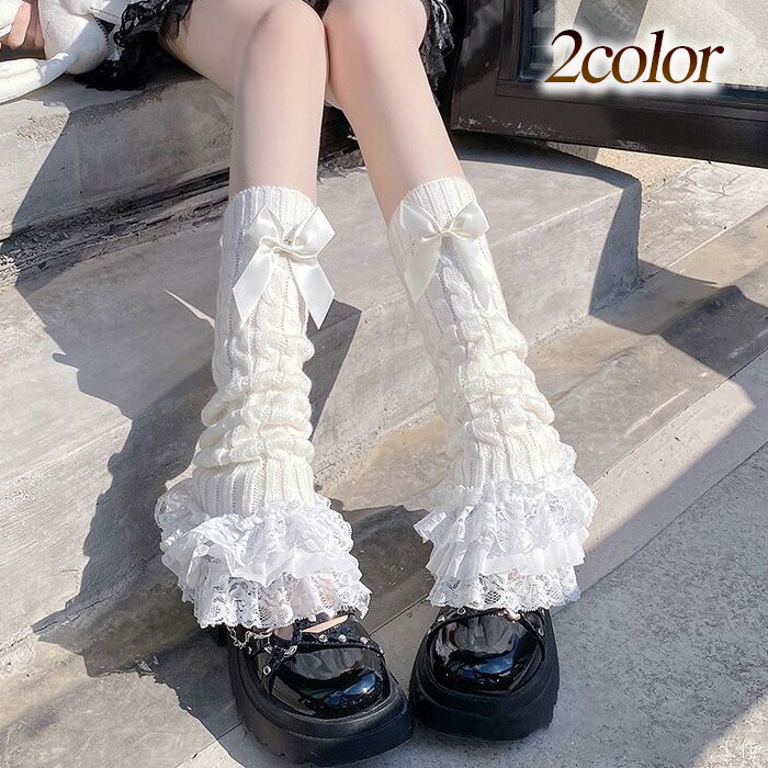 レッグウォーマー ニット レース フリル リボン ボリューム くしゅくしゅ ブラック ホワイト 1足 秋冬