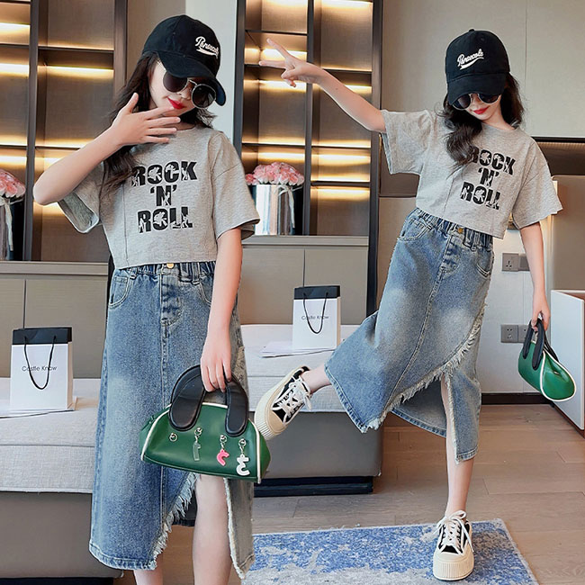 子供服 女の子 夏服 セットアップ 夏着 旅行 リゾート 通学着 可愛い 2点セット キッズ 上下セット 半袖 Tシャツ スカート デニム スリット カジュアル ガールズ 子 膝下
