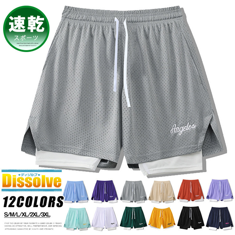 バスパン メンズ ストレッチ ハーフパンツ ショートパンツ 重ね着風 半ズボン バスケパンツ メッシュ 通気性 速乾性 ジュニア フィットネス ランニング スポーツ イベント トレーニング