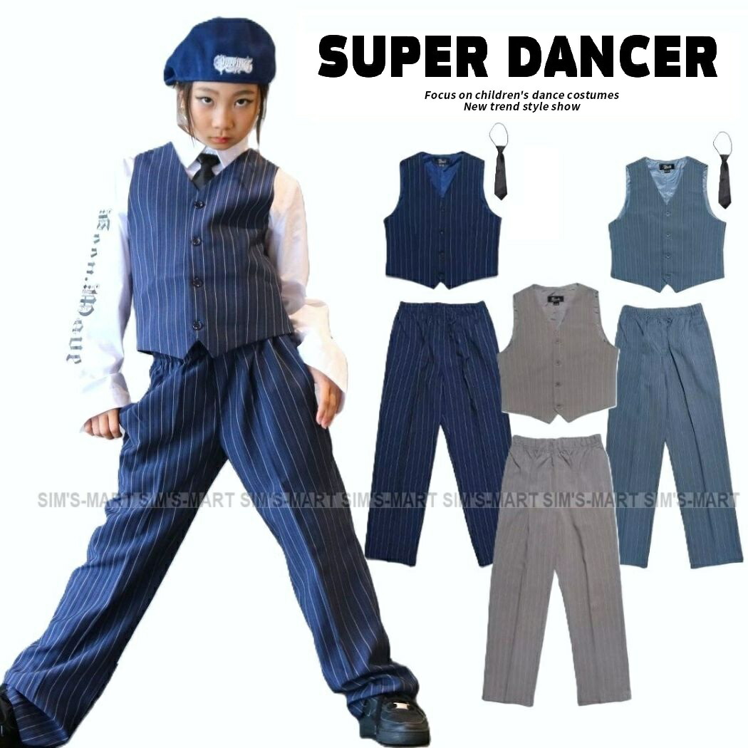 ロックダンス衣装 ポップダンス キッズ ダンス衣装 セットアップ 子供ダンス衣装 ダンスウェア レディース メンズ 大人 スーツ ストライプベスト ネイビー ブルー グレー スラックス