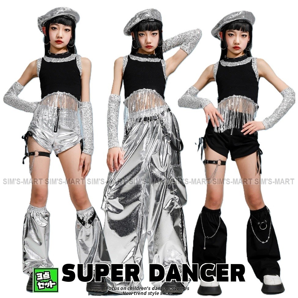 ダンス衣装 キッズ セットアップ スパンコール キラキラ衣装 ジャズ ガールズ ヒップホップ へそ出し トップス パンツ スカート 子供ダンス服 シルバー メタリック キッズダンス衣装 ダンスウェア