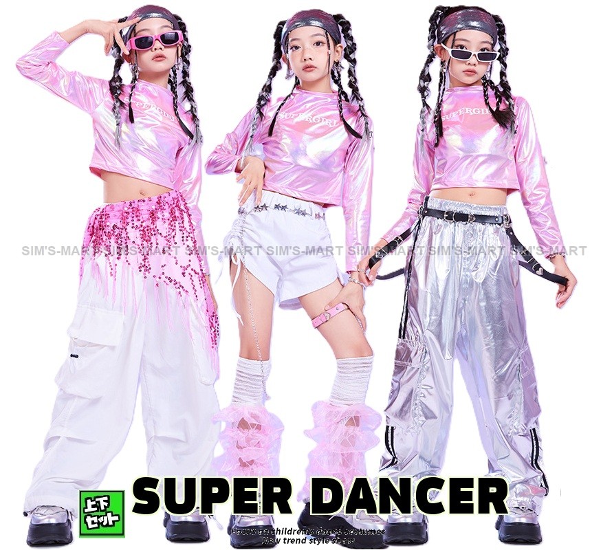 キッズダンス衣装 セットアップ ヒップホップ 衣装 子供ダンス服 派手 ガールズ 光沢 Tシャツ メタリックパンツ ダンス衣装 キッズ シルバー 白 ピンク 虹