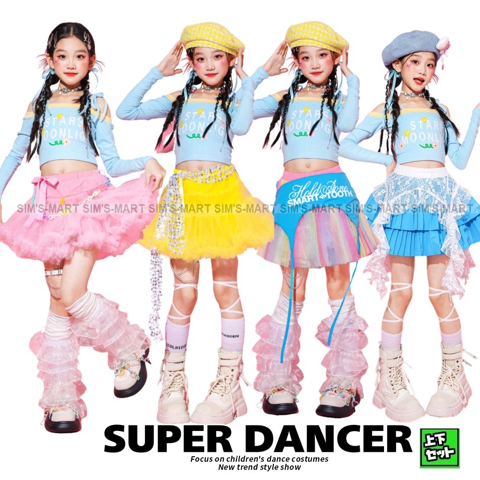 ダンス衣装 キッズ セットアップ チアダンス ガールズ ヒップホップ 衣装 オフショルトップス ふわふわ チュールスカート 派手 子供ダンス服 ダンスウェア K-POP 韓国 水色 ピンク レイ 黄色