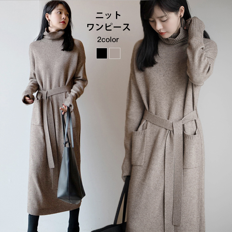 ニットワンピース ハイネック 長袖 厚手 秋冬 タートルネック ハイウエスト ゆったり ニット ベルト付き ポケット付き マタニティ レディース ロング丈 セーター 無地 体型カバー ロングワンピース